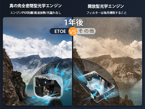 光学エンジンはプロジェクターの重要な部分です。ほとんどのプロジェクターはオープン光学エンジンを使用しますが、ETOE プロジェクターは完全に密閉された光学エンジンを適用します。これにより、光学エンジンへのゴミの侵入を防ぎ、投影された画像に黒点が現れるのを防ぎます。この特殊な設計により、ETOE プロジェクターはより長く動作し、鮮明な投影画像を得るために定期的に分解して掃除する必要がありません。
