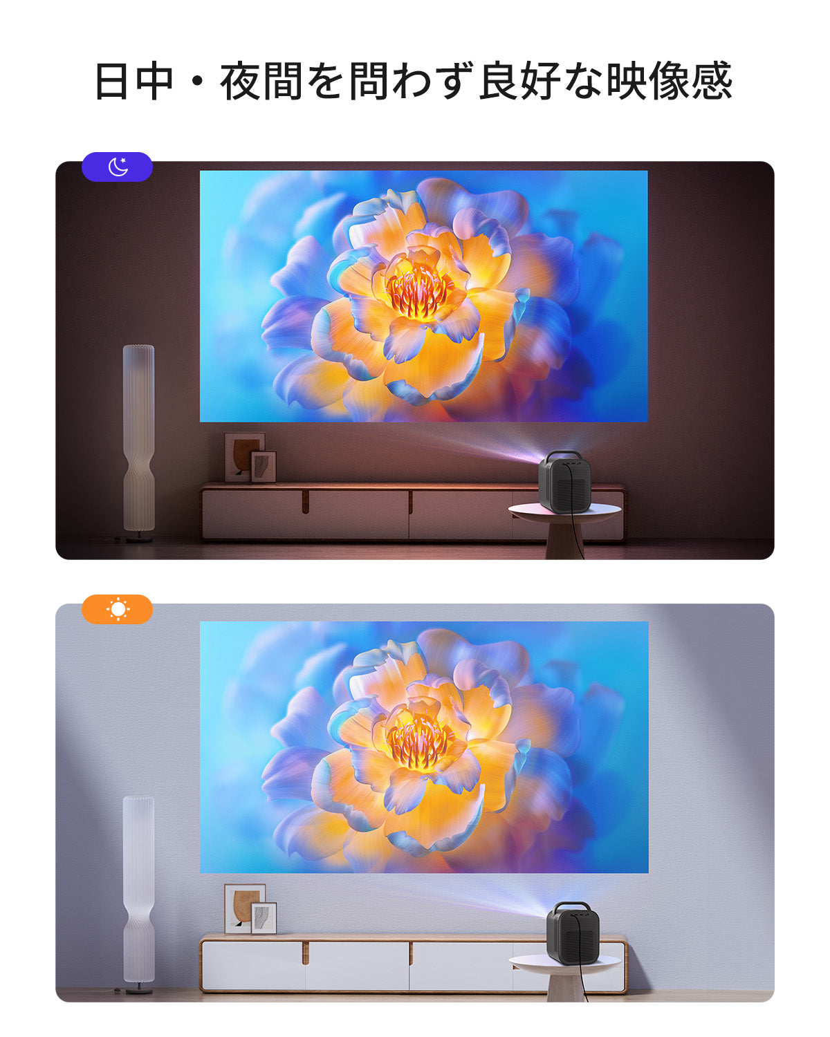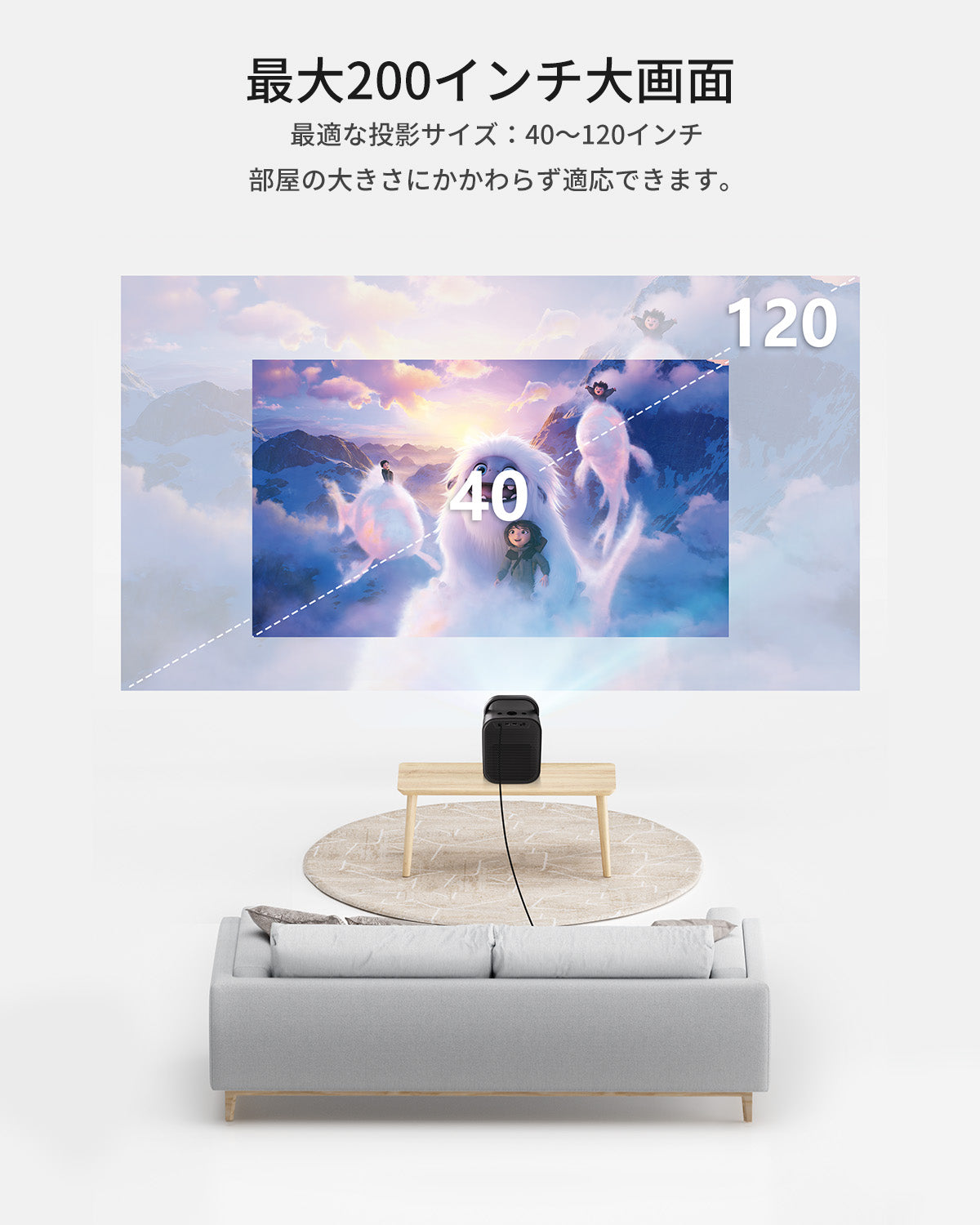 自動的に画像を調整し、プロジェクターを移動して大画面の映画体験をお楽しみいただけます。